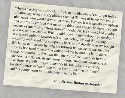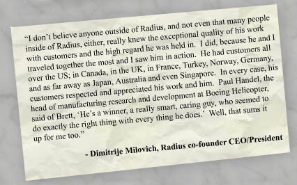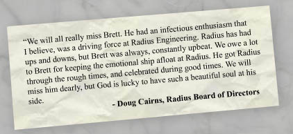 customer satisfaction through the process. From then until his death from complications of heart disease in April 2004, Brett worked with, taught, and inspired Radius employees, stockholders, and clients.