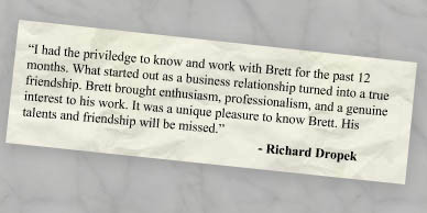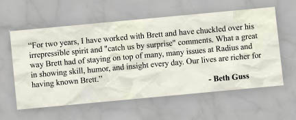 customer satisfaction through the process. From then until his death from complications of heart disease in April 2004, Brett worked with, taught, and inspired Radius employees, stockholders, and clients.